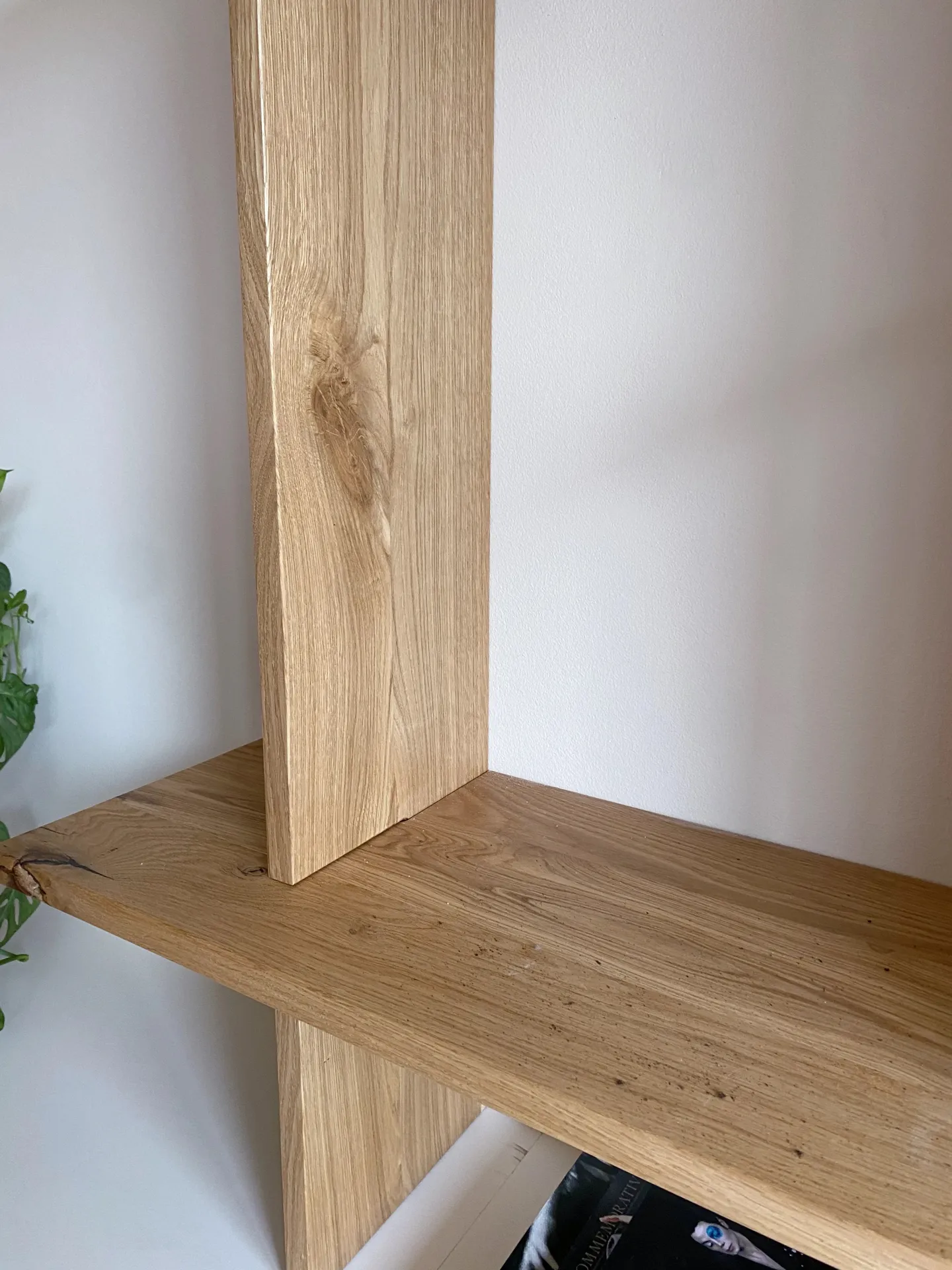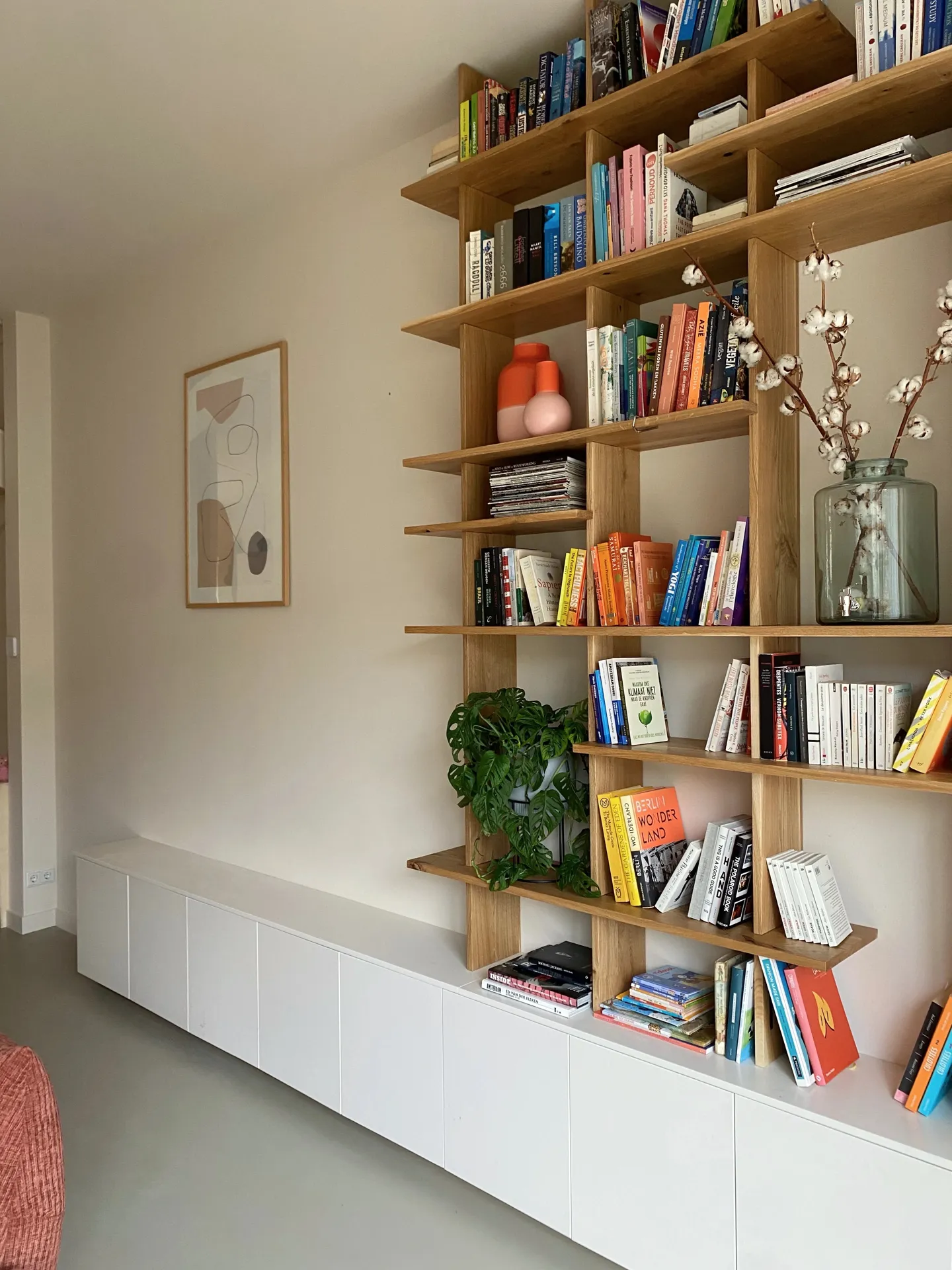Asymmetrical solid oak bookcase, integrated with low cabinet for kids storage