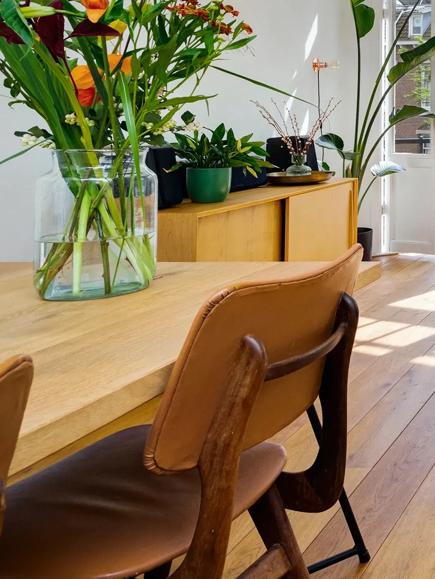 Solid oak kitchen table, with sleek metal legs